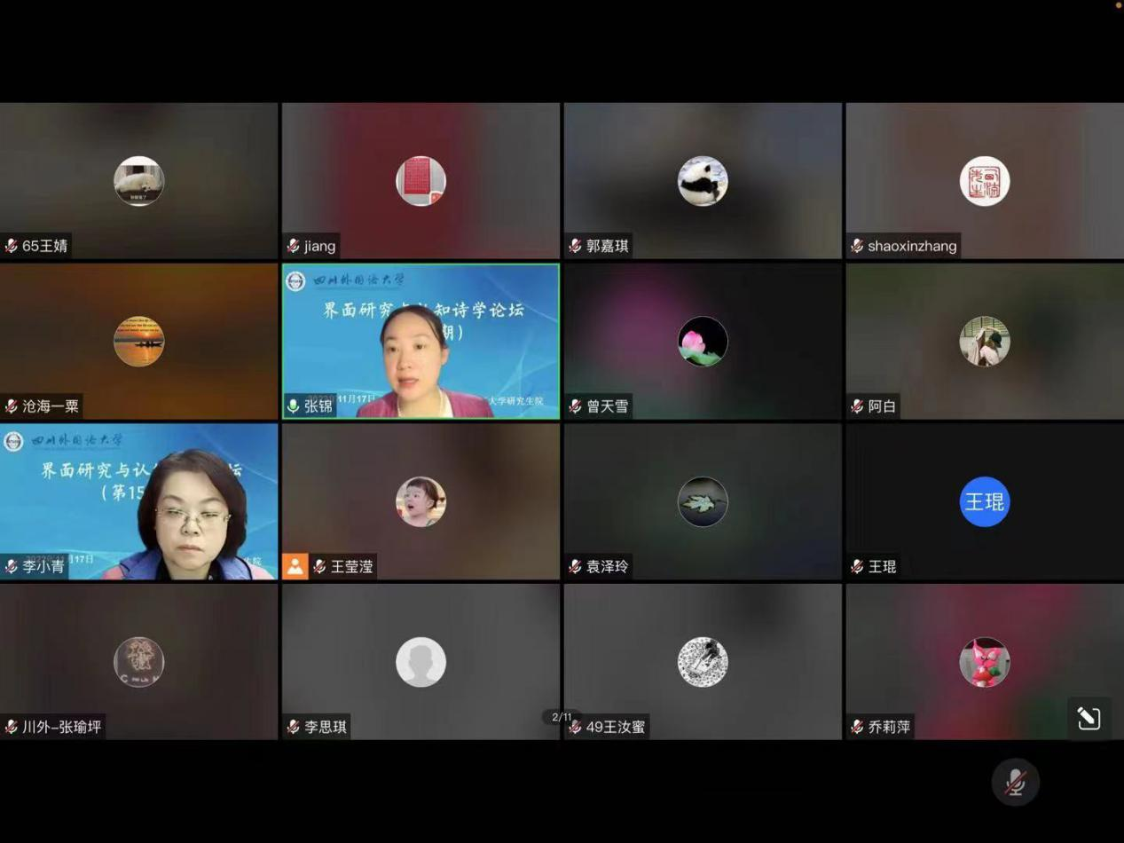 四川外国语大学研究生界面研究与认知诗学论坛(第153期)学术活动于11月17日(星期四)晚上在腾讯会议线上如期举行。本次活动特邀了中国社会科学院外国文学研究所编审张锦博士做题为“作为福柯知识的“中国”:百科全书与欧洲现代语言媒介史”的学术讲座。讲座由我校期刊社常务副社长李小青教授主持,我校众多老师,博士生和硕士生聆听了本次讲座。
